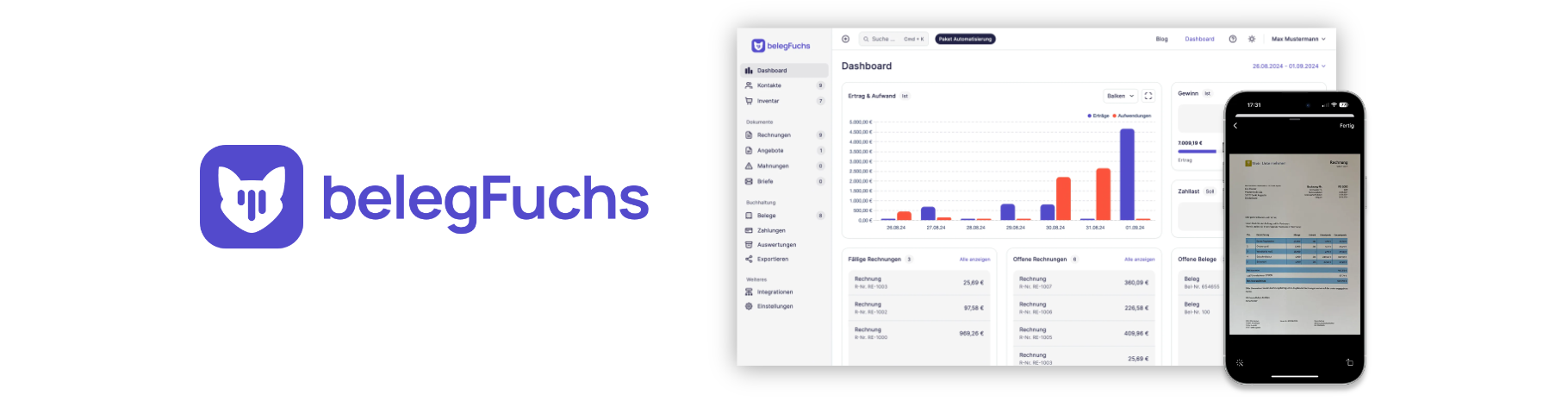 - Rechnungen schreiben: Erstellen Sie professionelle Rechnungen in wenigen Klicks und versenden Sie diese direkt aus der Software. Belegfuchs bietet Vorlagen und automatisiert die Berechnung von Umsatzsteuer und Skonti.